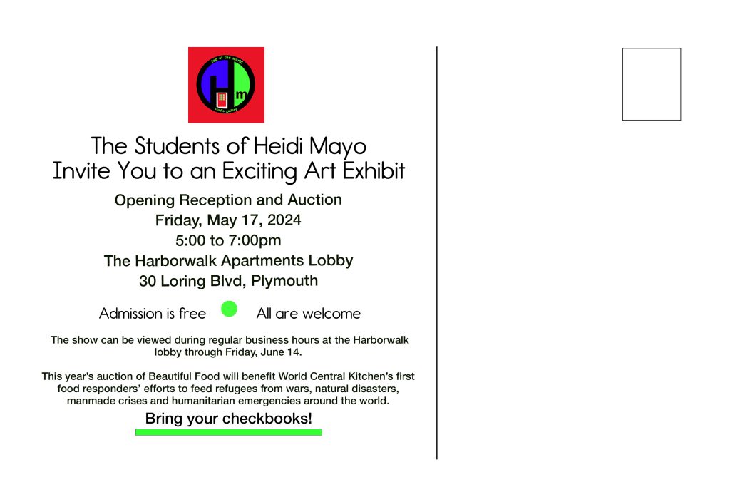 THE SHOW: This will be our 15th Annual Show. All pieces listed in the program will default to NFS (Not For Sale) unless kids tell me to put a price on them. There’s no commission so kids get to keep all of the sale price. The show will hang at the Harborwalk Apartments Lobby, 30 Loring Blvd at the Cordage in North Plymouth from the opening May 17, 5:00-7:00PM through June 14 during the lobby’s regular hours. All of the exhibitors get a T-shirt to keep and wear to the opening.