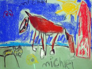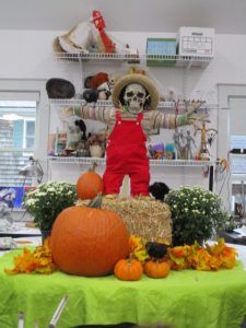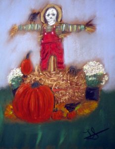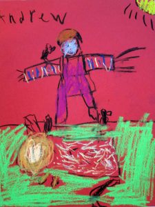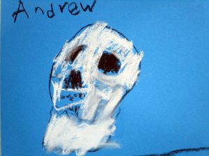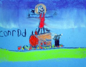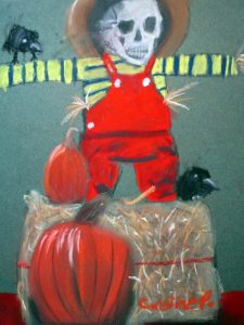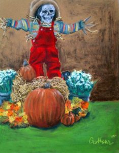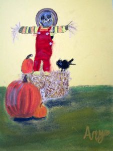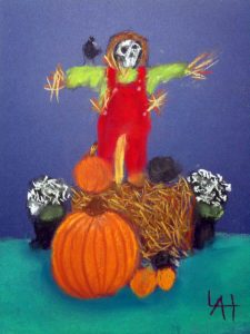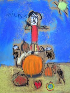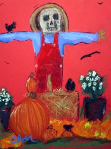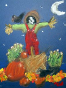 Moving right into the season. Kids did the scarecrow still life and other scary stuff. This week is Bones, an excellent Halloween anatomy lesson. Bones Mc Jones, Bones Jones’s replacement, is an academic doctor’s office skeleton that’s very hard to pose, so I ordered a pair of adult and child pose-able skeletons that should be arriving tomorrow. We’ll have a Bones family! Enjoy these autumn artworks, and scroll down for the schedule.