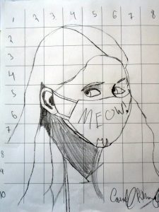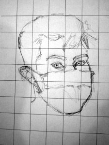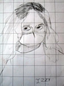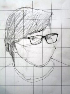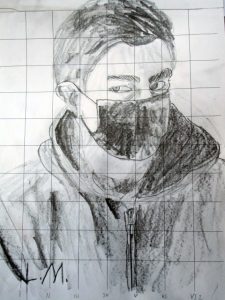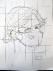 Our brains tend to make big deals out of very small things – like facial features. For the next few weeks we’ll be working on our self portraits. This week we used a grid to practice getting things to scale. Young artists often make giant eyes high up on the head because they have strong and persistent imagery in their big brains. The grid helps reign in those false perceptions while getting the artists to face facts about just how delicate and nuanced eyes, noses and mouths really are, how sometimes all they need is a little shadow to make them appear. The reason why our mask-optional poses are at 45 degrees is that I have found that automatically making faces straight forward is another default habit that we hope to break by trusting what our eyes see, not what our brain thinks. Enjoy the kids’ grids, and scroll down for the class schedule.