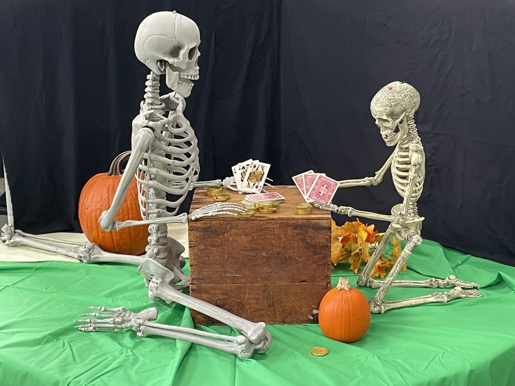 Last week we did spooky paintings; this week it’s Bones Jones. We learn a lot by painting skeletons, not just anatomy but proportions, foreshortening, values, gesture, negative space, and taking a complex subject and simplifying it. We’ve been doing Bones every year for about 20 years now, and this year they’re playing poker for gold doubloons.