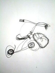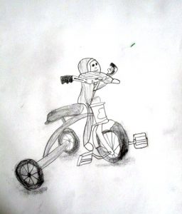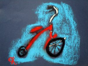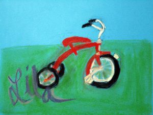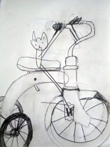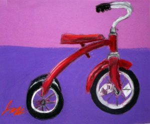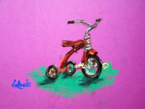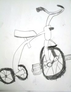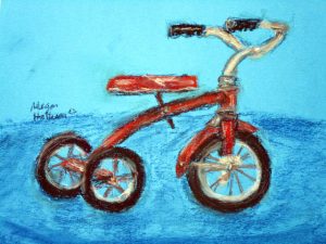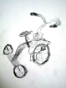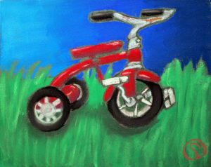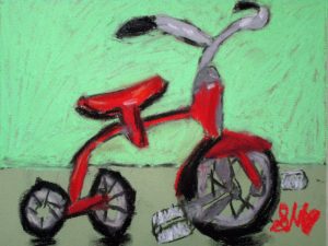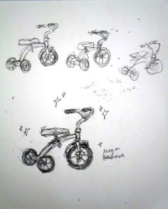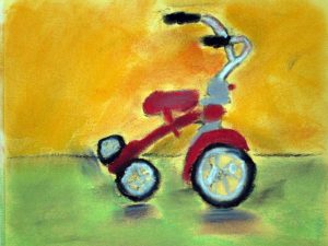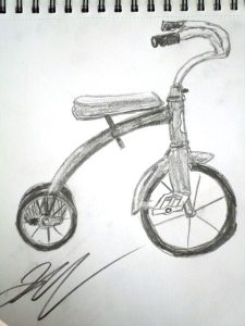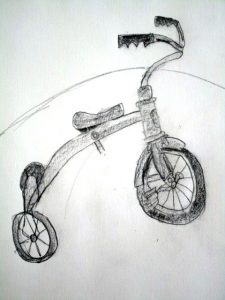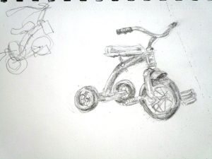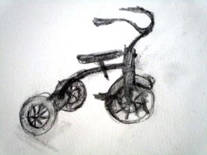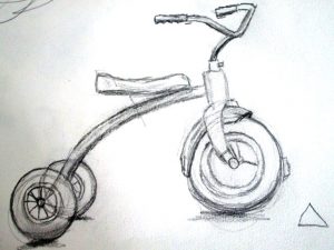 I found this great tricycle at an antique store down the street, and saw it as a perfect educational opportunity. Drawing and painting this trike offers a myriad of lessons in foreshortening, perspective, proportion, values, shapes & angles, and so much more! You’ll be seeing a lot of this trike over the next few weeks, as we’ll do pen and ink/watercolor and acrylic paintings of it too. The great masters often repeated the same theme or subject over and over, learning more and more each time. That’s what we’re doing with the trike.