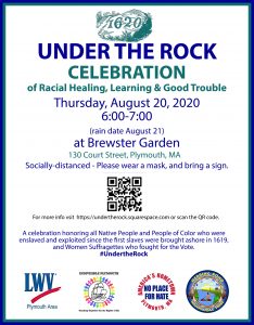 I’ve been an activist for the environment, civil rights, equal rights, etc. all of my life, and unfortunately I’m busier than ever these days. This month is about learning the real history, and celebrating those People who were marginalized, enslaved, and treated unequally, from the Native people to the Slaves brought here in 1619, and the Women Suffragettes who fought for the vote only 100 years ago. Join us – Indivisible Plymouth, Plymouth Area League of Women Voters, Plymouth No Place for Hate, and the Herring Pond Wampanoag Tribe – as we gather on August 20, 6-7:00 at Brewster Garden. Wear a mask, and bring a handmade sign. Kids are encouraged to make signs too, and they could enter them in the Diversity Art Challenge.